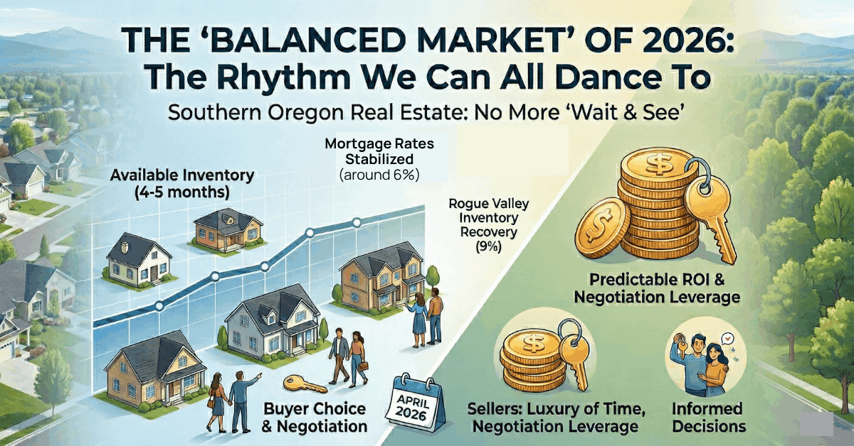 You finally have the luxury of time—but don’t mistake "balanced" for "buyer's market." Demand in Southern Oregon remains high due to our limited geographic footprint. However, you now have the room to negotiate on repairs or even ask for "rate buy-downs" from sellers.
